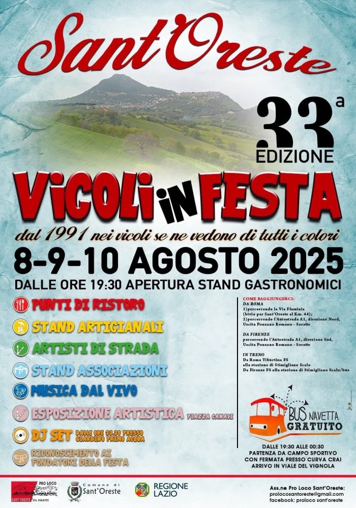 #VicoliInFesta #SantOreste2025 #FestaDiPaese #MusicaDalVivo #DJSetSottoLeStelle #Tradizione #EstateInLazio #ProLocoSantOreste #Comune di Sant’Oreste