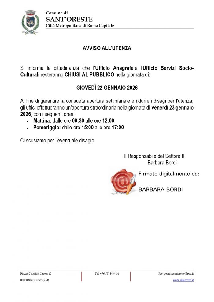 AVVISO- Chiusura Uff. Anagrafe e Servizi Sociali Giovedì 22 Gennaio 2026